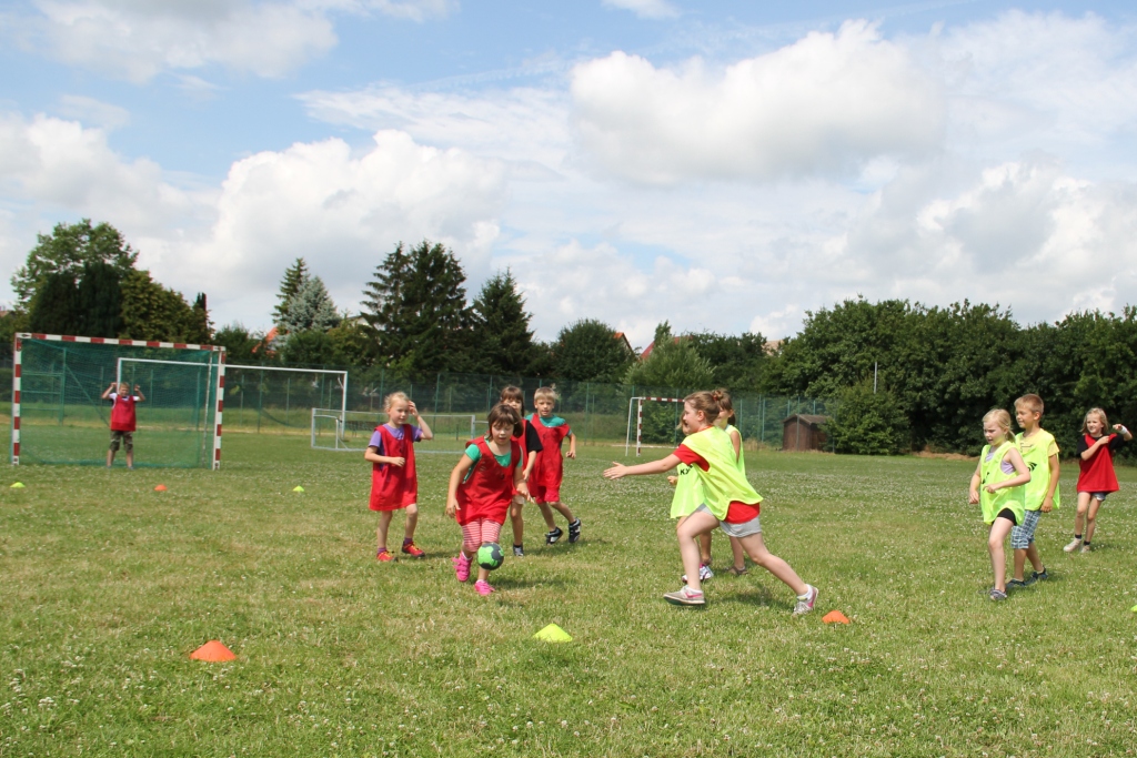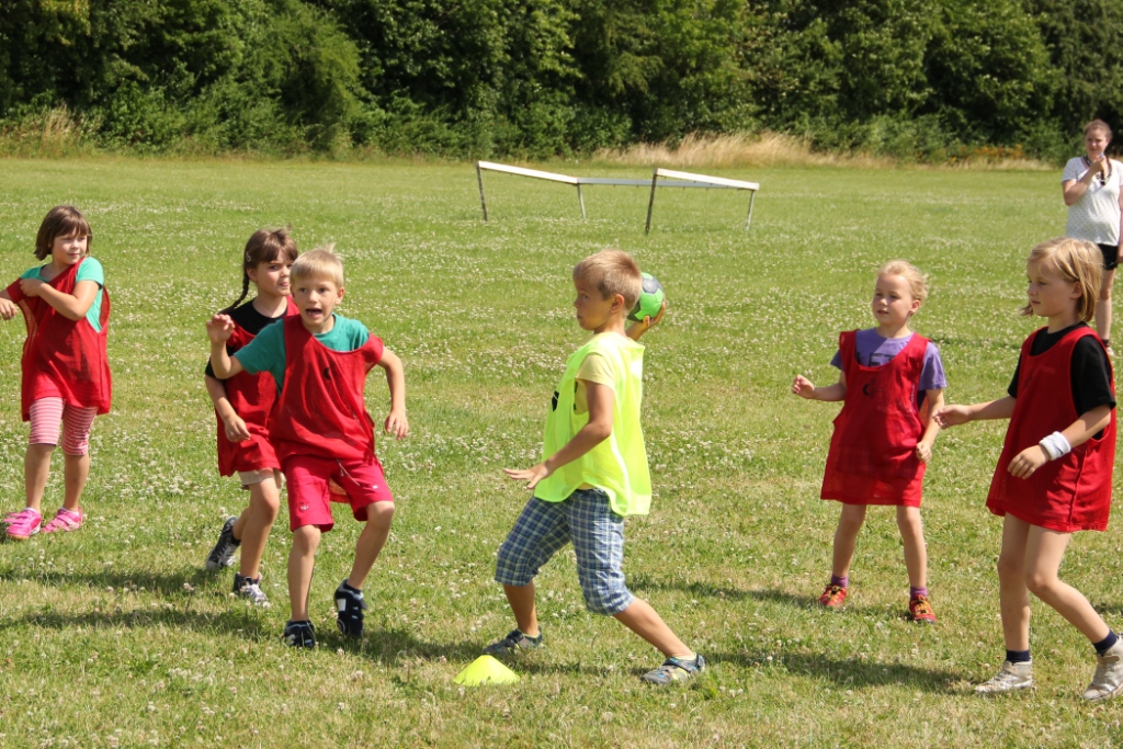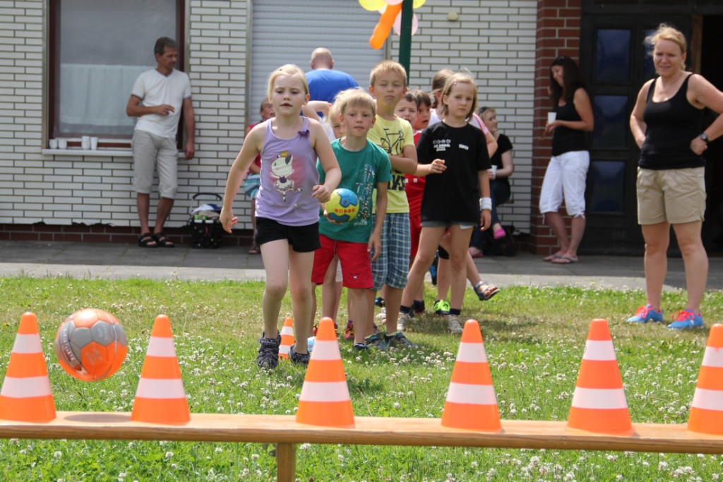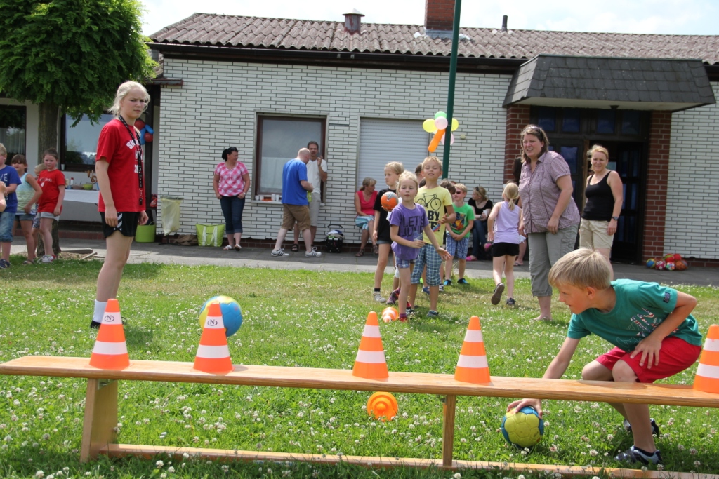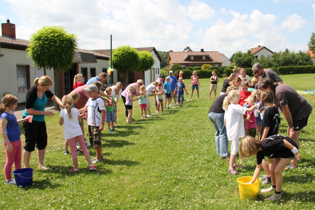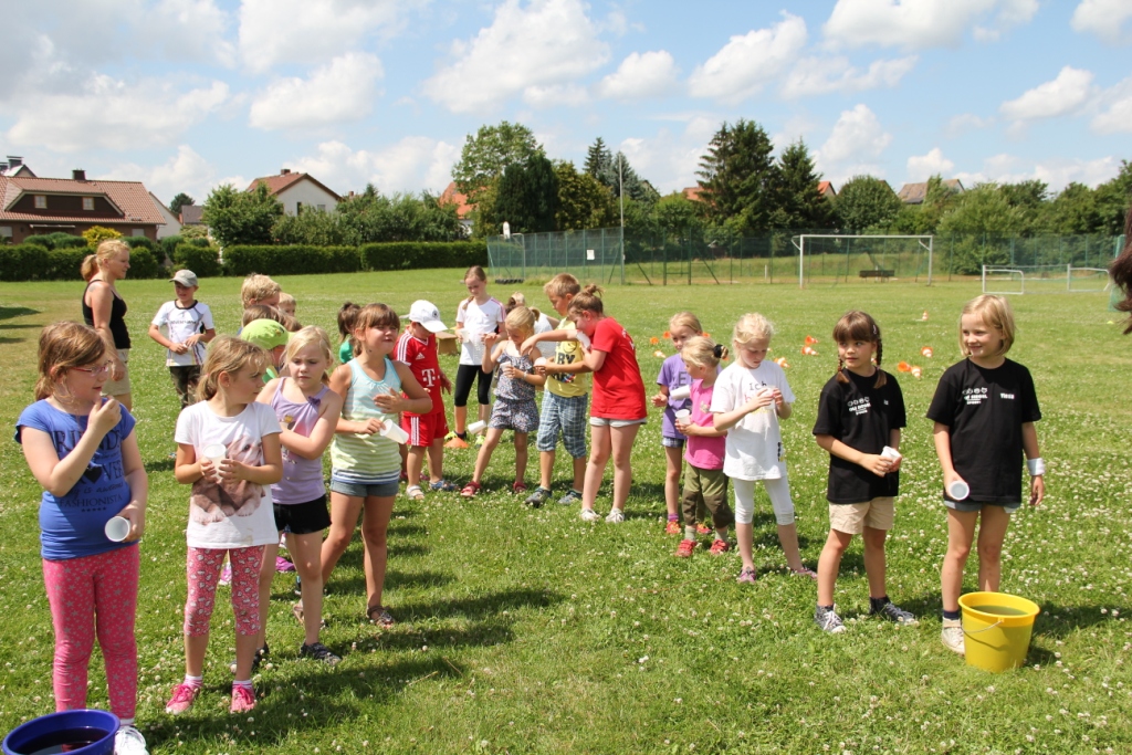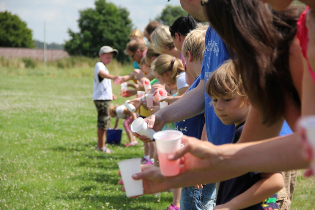Ein tolles Mittagsbuffet mit Hot Dogs und vielen mitgebrachten Leckereien sorgte für die nötige Stärkung. Danach ging es mit lustigen Spielen und Wettkämpfen weiter: Hütchen abwerfen, Maoam-Memory und – das Highlight – eine gemeinsame Wasserkette mit den Eltern. Hier machte es auch keinen Unterschied mehr wer „Warberger“ oder „Lelmer“ Mini war, alle kämpften und schütteten gemeinsam um den Sieg.
